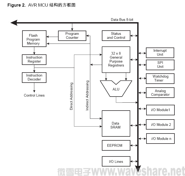 ALU支持寄存器之间以及寄存器和常数之间的算术和逻辑运算。ALU也可以执行单寄存器 操作。运算完成之后状态寄存器的内容得到更新以反映操作结果。