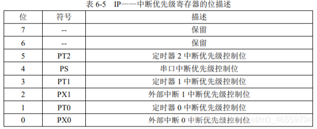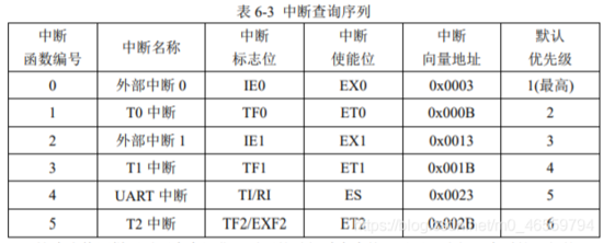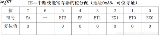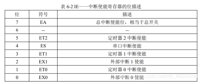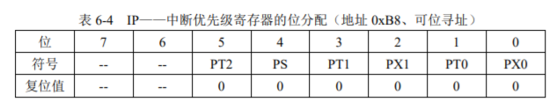 #include sbit ADDR0 = P1^0; sbit ADDR1 = P1^1; sbit ADDR2 = P1^2; sbit ADDR3 = P1^3; sbit ENLED = P1^4; unsigned char code LedChar[] = { //数码管显示字符转换表 0xC0, 0xF9, 0xA4, 0xB0, 0x99, 0x92, 0x82, 0xF8, 0x80, 0x90, 0x88, 0x83, 0xC6, 0xA1, 0x86, 0x8E }; unsigned char LedBuff[] = { //数码管显示缓冲区,初值0xFF确保启动时都不亮 0xFF, 0xFF, 0xFF, 0xFF, 0xFF, 0xFF }; void main() { unsigned int cnt = 0; //记录定时器溢出次数 unsigned long sec = 0; //记录经过秒数 unsigned char i = 0; //动态扫描的索引 ENLED = 0; //使能U3,选择控制数码管 ADDR3 = 1; //因为需要改变ADDR0-2的值,所以不需要再初始化 TMOD = 0x01;//设置T0为模式一 TH0 = 0xFC;//为TO赋初值0xFC67,定时1ms TL0 = 0x67; TR0 = 1; //启动T0 while(1) { if(TF0 == 1)//判断T0是否溢出 { TF0 = 0; //T0溢出后,清零中断标志 TH0 = 0xFC;//为TO重新赋值 TL0 = 0x67; cnt++; //计数值加一 if(cnt >= 1000)//判断T0是否溢出1000次 { cnt = 0; //溢出10000次后计数值清零 sec++; //秒数自加一 //以下代码将sec按十进制位从低到高依次提取并转为数码管显示字符 LedBuff[0] = LedChar[sec%10]; LedBuff[1] = LedChar[sec/10%10]; LedBuff[2] = LedChar[sec/100%10]; LedBuff[3] = LedChar[sec/1000%10]; LedBuff[4] = LedChar[sec/10000%10]; LedBuff[5] = LedChar[sec/100000%10]; } //以下代码完成数码管的动态扫描刷新 switch(i) { case 0: ADDR2=0;ADDR1=0;ADDR0=0;P0 = LedBuff[0];i++;break; case 1: ADDR2=0;ADDR1=0;ADDR0=1;P0 = LedBuff[1];i++;break; case 2: ADDR2=0;ADDR1=1;ADDR0=0;P0 = LedBuff[2];i++;break; case 3: ADDR2=0;ADDR1=1;ADDR0=1;P0 = LedBuff[3];i++;break; case 4: ADDR2=1;ADDR1=0;ADDR0=0;P0 = LedBuff[4];i++;break; case 5: ADDR2=1;ADDR1=0;ADDR0=1;P0 = LedBuff[5];i=0;break; default: break; } } } } 1.3 数码管显示的消隐 上面程序控制数码管的动态显示秒表会出现两大问题,一个是数码管的鬼影问题(数码管不该发亮的段,微微发亮),另一个是数码管的抖动问题(数码管数字变化时,不参加变化的2数码管出现抖动)。 1.3.1数码管显示的鬼影成因及解决办法 成因:主要由于数码管的位选和段选产生的瞬态。比如在上面的动态显示程序中,case 5要转换到case 0的时候,假如case 5对应数码管值为0,case 1对应数码管的值为1,因为c语言语句执行需要一定的时间,在case 5的位选用ADDR0=1;ADDR1 =0;ADDR2 = 1;转换为case 0的位选用ADDR0=0;ADDR1 =0;ADDR2 = 0;时,就会出现位选用中间状态的瞬间ADDR0=1;ADDR1 =0;ADDR2 = 1;,在这瞬间,会给csae 4对应数码管DS5瞬间赋值一个0。当case的位选用转换成功后,因为P0还没执行,而P0保持上一个值,在这瞬间case 0 对应数码管DS1赋值一个0。这两个瞬间都产生了鬼影。 解决方案:(1). 刷新之前关闭所有的段,改变好位选用后,再打开所有的段。只需在上面动态显示程序中在switch(i)语句前一句加上P0=0xFF;语句即可在解决鬼影问题。(2). 刷新之前关闭所有的位,赋值过程都做好,再重新打开所有的位。只需要上面动态显示程序中在switch(i)语句前一句加上ENLED=1;,在switch(i)语句后一句加上ENLED=0;即可解决鬼影问题。 1.3.2 数码管显示的抖动成因及解决办法 成因:在上面的动态显示程序中,由于程序每次定时到1s时,会执行 “秒数+1并转化为数码管显示字符” 的操作,因为这段代码比较耗时间,就会导致某个数码管点亮时间为1ms+该程序执行时间,而下一个数码管的点亮时间就变为1ms - 该程序运行时间。这就是数码管显示抖动的成因。 解决办法:运用中断机制即可解决该问题,下面来介绍单片机中断系统。 2、单片机的中断系统 2.1 中断系统的引入 当单片机专心的做一件事(比如打游戏)的时候,突然有一件或多件紧急的事(比如水开了)要去处理,应该先停下这件事(打游戏),先去处理紧急的事(水开了)。这就应用了单片机中断系统,利用中断处理突发情况,让单片机能够同时“完成”多项任务。 2.2定器中断模块应用 2.2.1中断系统的IE-中断使能寄存器 标准51单片机控制中断模块有两个寄存器,一个是中断使能寄存器,另一个是中断优先级寄存器。下面来介绍IE-中断使能寄存器。 上表为IE-中断使能寄存器的位分配 讲解:中断使能寄存器 IE 的位 0~5 控制了 6 个中断使能,第 6 位没有用到,第 7 位是总开关,而0 ~ 5 位为分开关,只要用到中断,就要写EA=1打开总开关 2.2.1数码管动态显示秒表消隐程序及讲解 #include sbit ADDR0 = P1^0; sbit ADDR1 = P1^1; sbit ADDR2 = P1^2; sbit ADDR3 = P1^3; sbit ENLED = P1^4; unsigned char code LedChar[] = { //数码管显示字符转换表 0xC0, 0xF9, 0xA4, 0xB0, 0x99, 0x92, 0x82, 0xF8, 0x80, 0x90, 0x88, 0x83, 0xC6, 0xA1, 0x86, 0x8E }; unsigned char LedBuff[] = { //数码管显示缓冲区,初值0xFF确保启动时都不亮 0xFF, 0xFF, 0xFF, 0xFF, 0xFF, 0xFF }; unsigned char flagls = 0; //1s定时标志 unsigned int cnt = 0; //记录T0中断次数 unsigned char i = 0; //动态扫描索引 unsigned long sec = 0; //记录经过的秒数 void main() { ENLED = 0; //使能U3 ADDR3 = 1; //因为需要动态改变ADDR0-2的值,所以不需要在初始化了 EA = 1; //使能总中断 TMOD = 0x01; //设置T0为模式一 TH0 = 0xFC; //为T0赋初值0xFC67,定时1ms TL0 = 0x67; ET0 = 1; //使能T0中断 TR0 = 1; //开启T0 while(1) { if(flagls == 1) //判断1s定时标志 { flagls = 0; //1秒定时标志清零 sec++;//秒计数自动加一 //以下代码将sec按十进制从低位到高依次提取并转为数码管显示字符 LedBuff[0] = LedChar[sec%10]; LedBuff[1] = LedChar[sec/10%10]; LedBuff[2] = LedChar[sec/100%10]; LedBuff[3] = LedChar[sec/1000%10]; LedBuff[4] = LedChar[sec/10000%10]; LedBuff[5] = LedChar[sec/100000%10]; } } } //定时器T0中断服务函数 void InterruptTimer0() interrupt 1 { TH0 =0xFC;//重