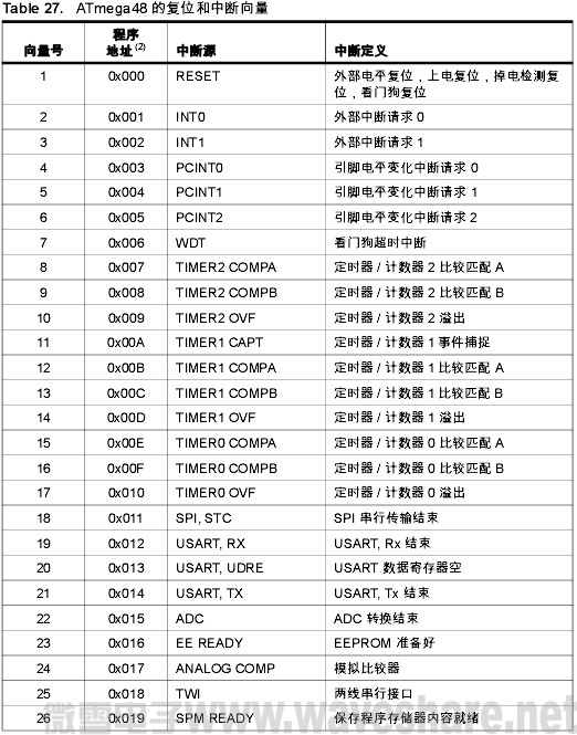 本节描述 ATmega48/88/168 的中断处理。更一般的 AVR 中断处理请参见 P11” 复位与中断处理 ” 。