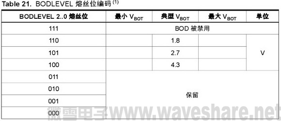 VBOT 可能低于某些器件的最小标称工作电压。对于有这种情形的器件,在产品测试时 将做VCC = VBOT 的实验。这保证了在芯片工作电压 VCC 降至微处理器已经无法正常工 作之前,掉电复位必定发生。ATmega48V/88V/168V 用 BODLEVEL = 110 与 BODLEVEL = 101 做检测, ATmega48/88/168 用 BODLEVEL = 101 与 BODLEVEL = 101 做检测。