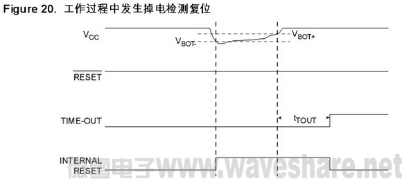 BOD 使能后,一旦 VCC 下降到触发电平以下 (VBOT- ,Figure20),BOD 复位立即被激发当 VCC 上升到触发电平以上时 (VBOT+, Figure20),延时计数器开始计数,一旦超过溢出时间 tTOUT, MCU 即恢复工作。