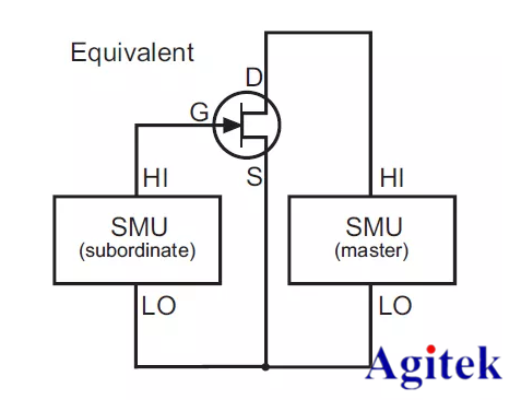 SMUA和SMUB的LO接到器件的源极,然后一个SMU的HI接到栅极、另外一个SMU的HI接到漏极。