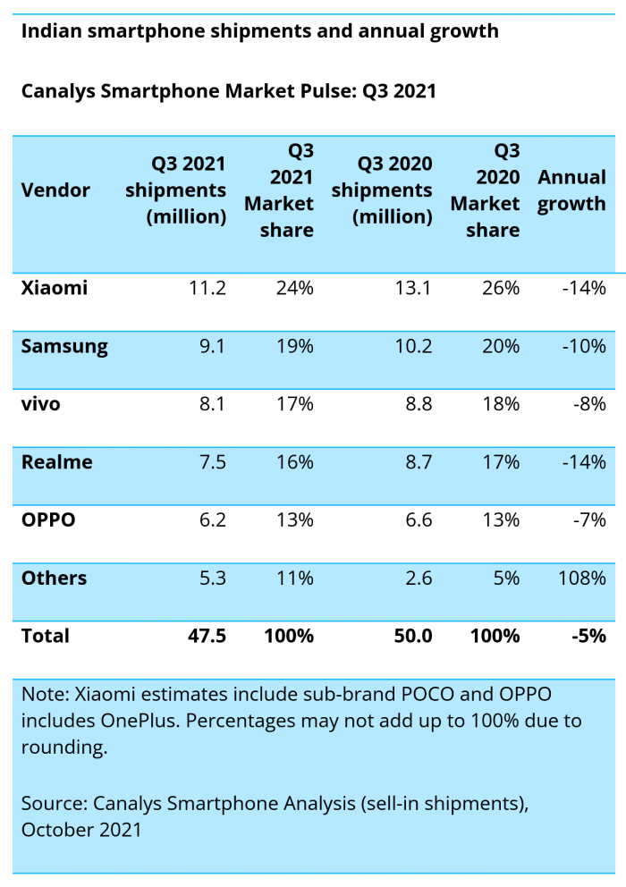 2021年10月22日 | Canalys:印度市场第三季度手机出货量下滑5% 小米仍是首位