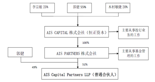 据披露,AIS Capital Partners LLP主要股东为 AISPARTNERS 株式会社、郭健。其中,郭健直接持股 49%, AISPARTNERS 株式会社作为 AIS CAPITAL 株式会社(恒正资本)下设全资子公司,主要从事基金管理工作,持股占比 51%。同时,郭健为恒正资本控股股东,股权架构如下: