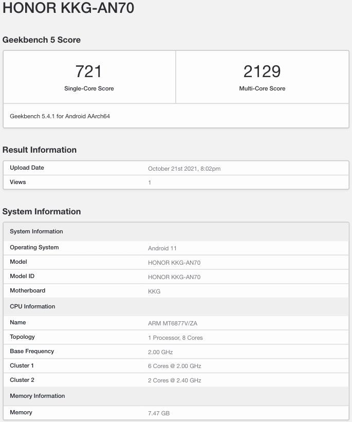 IT之家获悉,这款手机与荣耀 Play5 活力版的跑分信息在 GeekBench 5 曝光。两款产品均搭载联发科天玑 900 处理器,单核成绩为 720 分左右,多核成绩 2100 分左右,荣耀 X30 Max 分数稍高。手机均搭载 8GB 内存,运行 Android 11 系统。外媒 91 Mobiles 预计,荣耀 X30 Max 手机将内置 6000mAh 电池,采用 LCD 液晶屏,屏幕尺寸可达 7.2 英寸。