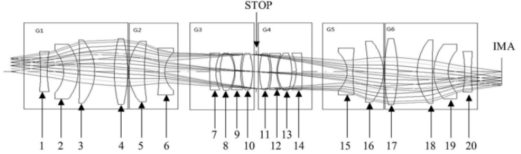 第一透镜组G1、第三透镜组G3、第四透镜组G4以及第六透镜组G6具有正的光焦度,第二透镜组G2以及第五透镜组G5具有负的光焦度。光焦度等于像方光束会聚度与物方光束会聚度之差,它表征光学系统偏折光线的能力。光焦度的绝对值越大,对光线的弯折能力越强,反之对光线的弯折能力越弱。光焦度为正数时,光线的屈折是汇聚性的,反之则是是发散性的。光焦度可以适用于表征一个透镜的某一个折射面,或表征某一个透镜,也可以适用于表征多个透镜共同形成的系统。