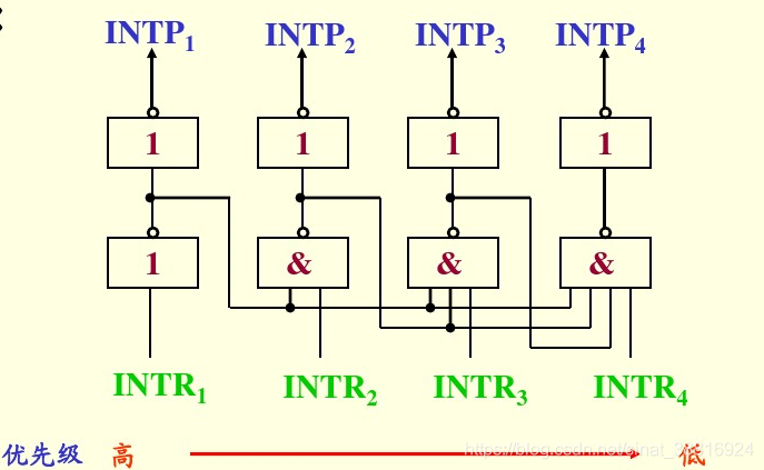 同一优先级中的中断申请不止一个时,则有中断优先权排队问题。同一优先级的中断优先权排队,由中断系统硬件确定的自然优先级形成,其排列如所示: