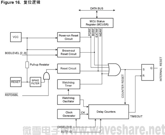 所有的复位信号消失之后,芯片内部的一个延迟计数器被激活,将内部复位的时间延长。这种处理方式使得在 MCU 正常工作之前有一定的时间让电源达到稳定的电平。延迟计数器的溢出时间通过熔丝位 SUT 与 CKSEL 设定。延迟时间的选择请参见 P24”时钟源 ” 。