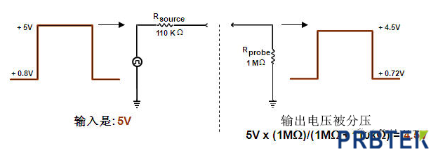 阻性负载相当于在被测电路上并联了一个电阻,对被测信号有分压的作用,影响被测信号的幅度和直流偏置。有时,加上探头时,有故障的电路可能变得正常了。一般推荐探头的电阻R>10倍被测源电阻,以维持小于10%的幅度误差。