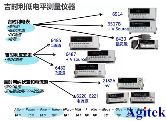 下图是我们对吉时利低电平测量仪器的汇总,包含对低电流、低电压、低电阻、高电阻等的测量。