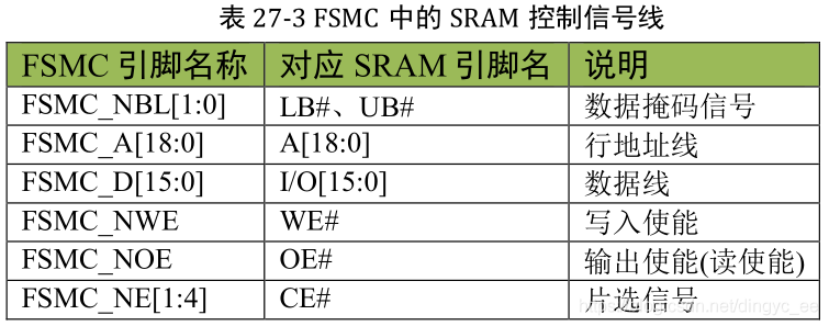 其中比较特殊的 FSMC_NE 是用于控制 SRAM 芯片的片选控制信号线,STM32 具有FSMC_NE1/2/3/4 号引脚,不同的引脚对应 STM32 内部不同的地址区域。例如,当 STM32访问 0x68000000-0x6BFFFFFF 地址空间时,FSMC_NE3 引脚会自动设置为低电平,由于它连接到 SRAM的 CE#引脚,所以 SRAM的片选被使能,而访问 0x60000000-0x63FFFFFF地址时,FSMC_NE1 会输出低电平。当使用不同的 FSMC_NE 引脚连接外部存储器时,STM32 访问 SRAM 的地址不一样,从而达到控制多块 SRAM 芯片的目的。