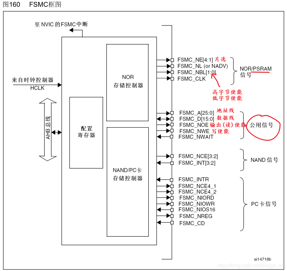 在框图的右侧是 FSMC 外设相关的控制引脚,由于控制不同类型存储器的时候会有一些不同的引脚,看起来有非常多,其中地址线 FSMC_A和数据线 FSMC_D是所有控制器都共用的。