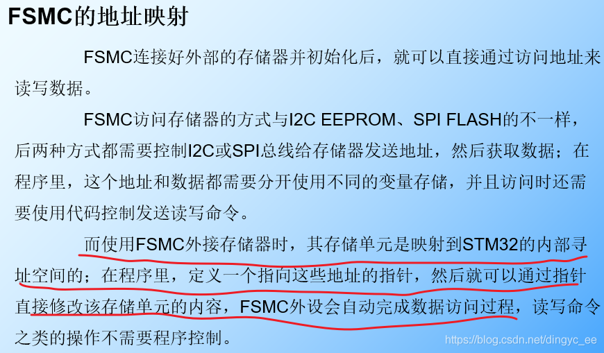 STM32F1 系列芯片使用 FSMC 外设来管理扩展的存储器,FSMC 是 Flexible Static Memory Controller 的缩写,译为灵活的静态存储控制器。它可以用于驱动包括 SRAM、NOR FLASH 以及 NAND FLSAH 类型的存储器,不能驱动如 SDRAM这种动态的存储器而在 STM32F429 系列的控制器中,它具有 FMC 外设,支持控制 SDRAM存储器。