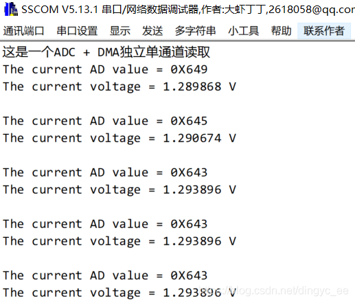 #include __IO uint16_t ADC_ConvertedValue; // 局部变量,用于保存转换计算后的电压值 float ADC_ConvertedValueLocal; void Delay(__IO uint32_t nCount) { for(; nCount != 0; nCount--); } int main(void) { LED_GPIO_Config(); USART_config(); ADCx_Init(); printf("这是一个ADC独立单通道读取实验tn"); while (1) { ADC_ConvertedValueLocal =(float) ADC_ConvertedValue / 4096 * 3.3; printf("The current AD value = %#X tn", ADC_ConvertedValue); printf("The current voltage = %f V tn", ADC_ConvertedValueLocal); printf("n"); LED_B_TOGGLE; Delay(0x2fffee); } } 实验现象如下: 实验二:独立单通道DMA读取 当要传输大量的数据时,一般都是采用DMA。ADC + DMA本身的配置非常简单,就只需要注意,只能使用ADC1或ADC3,而ADC2无DMA传输功能。 这里主要看一下ADC + DMA配置: /** * @brief ADC - DMA配置 * @note 注意,ADC - DMA只能使用ADC1 或 ADC3,ADC2无DMA功能 */ static void ADCx_DMA_Config(void) { DMA_InitTypeDef DMA_InitStructure; RCC_AHBPeriphClockCmd(RCC_AHBPeriph_DMA1, ENABLE); DMA_DeInit(ADC_DMA_CHANNEL); DMA_InitStructure.DMA_PeripheralBaseAddr = (uint32_t)(&(ADC_x->DR)); DMA_InitStructure.DMA_MemoryBaseAddr = (uint32_t)&ADC_ConvertedValue; DMA_InitStructure.DMA_DIR = DMA_DIR_PeripheralSRC; DMA_InitStructure.DMA_BufferSize = 1; DMA_InitStructure.DMA_PeripheralInc = DMA_PeripheralInc_Disable; DMA_InitStructure.DMA_MemoryInc = DMA_MemoryInc_Disable; DMA_InitStructure.DMA_PeripheralDataSize = DMA_PeripheralDataSize_HalfWord; DMA_InitStructure.DMA_MemoryDataSize = DMA_MemoryDataSize_HalfWord; DMA_InitStructure.DMA_Mode = DMA_Mode_Circular; DMA_InitStructure.DMA_Priority = DMA_Priority_High; DMA_InitStructure.DMA_M2M = DMA_M2M_Disable; DMA_Init(ADC_DMA_CHANNEL, &DMA_InitStructure); DMA_Cmd(ADC_DMA_CHANNEL , ENABLE); } 然后在ADC配置函数中进行调用,再使能ADC + DMA: /* ADC - DMA设置要在使能ADC完成 */ ADCx_DMA_Config(); // 配置ADC - DMA ADC_DMACmd(ADC_x, ENABLE); // 使能 ADC DMA 请求 然后在main.c中进行测试,结果如下: