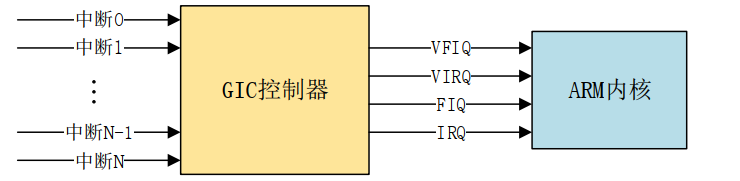 在上图中, GIC 接收众多的外部中断,然后对其进行处理,最终就只通过四个信号报给 ARM 内核,这四个信号的含义如下:
