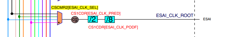 ③、此部分又是一个分频器,对②中输出的时钟进一步分频,分频值由寄存器CCM_CS1CDR 的 ESAI_CLK_PODF 来决定,可设置 1~8 分频。假如我们设置为 8 分频的话,经过此分频器以后的时钟就是 325/8=40.625MHz。因此最终进入到 ESAI 外设的时钟就是40.625MHz。