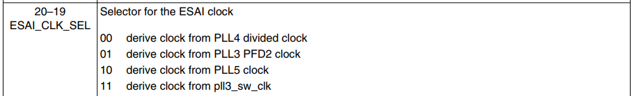 ①、此部分是时钟源选择器, ESAI 有 4 个可选的时钟源: PLL4、 PLL5、 PLL3_PFD2 和pll3_sw_clk 。 具 体 选 择 哪 一 路 作 为 ESAI 的 时 钟 源 是 由 寄 存 器 CCM->CSCMR2 的ESAI_CLK_SEL 位来决定的,用户可以自由配置,配置如图: