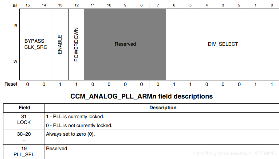 再来看一下寄存器CCM_ANALOG_PLL_ARMn,此寄存器结构如图所示: