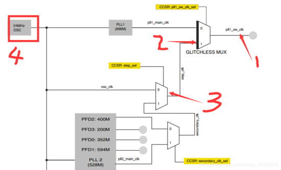 * 源。 如果我们要修改 pll1_main_clk 时钟的话就必须先将 pll1_sw_clk 从