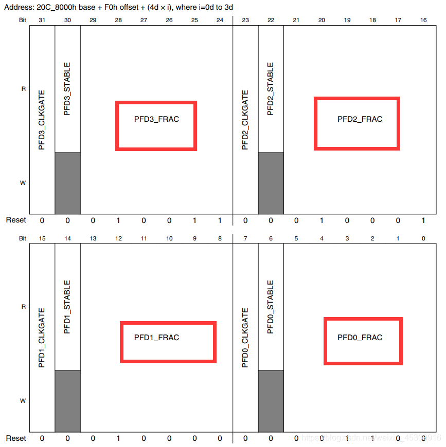 从图可以看出,寄存器 CCM_ANALOG_PFD_528n 其实分为四组,分别对应PFD0~PFD3,每组 8 个 bit,我们就以 PFD0 为例,看一下如何设置 PLL2_PFD0 的频率。 PFD0对应的寄存器位如下: