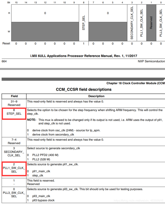 寄存器 CCM_CCSR 我们只用到了 STEP_SEL、 PLL1_SW_CLK_SEL 这两个位,一个是用来选择 step_clk 时钟源的,一个是用来选择 pll1_sw_clk 时钟源的。