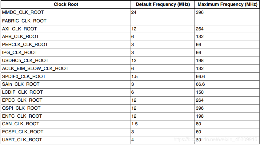的时钟, I.MX6U 外设根时钟可设置范围如图所示: