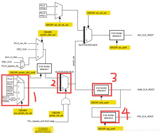 ①、此选择器用来选择 pre_periph_clk 的时钟源,可以选择 PLL2、 PLL2_PFD2、 PLL2_PFD0和 PLL2_PFD2/2。寄存器 CCM_CBCMR 的 PRE_PERIPH_CLK_SEL 位决定选择哪一个,默认选择 PLL2_PFD2,因此 pre_periph_clk=PLL2_PFD2=396MHz。