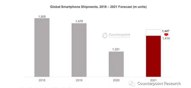 无独有偶,Counterpoint Research也下调了今年全球智能手机的出货量预期,由最初14.5亿部减少为14.1亿部,增长预期也从9%下调至6%。