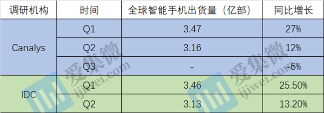 IDC数据显示,2021年Q1全球智能手机出货量达3.46亿台,同比增长25.5%;Q2出货量为3.13亿部,同比增长13.2%。Canalys报告也显示,Q1全球智能手机出货量达到3.47亿部,同比增长27%;Q2出货量为3.16亿部,同比增长12%,但较Q1下降9%。