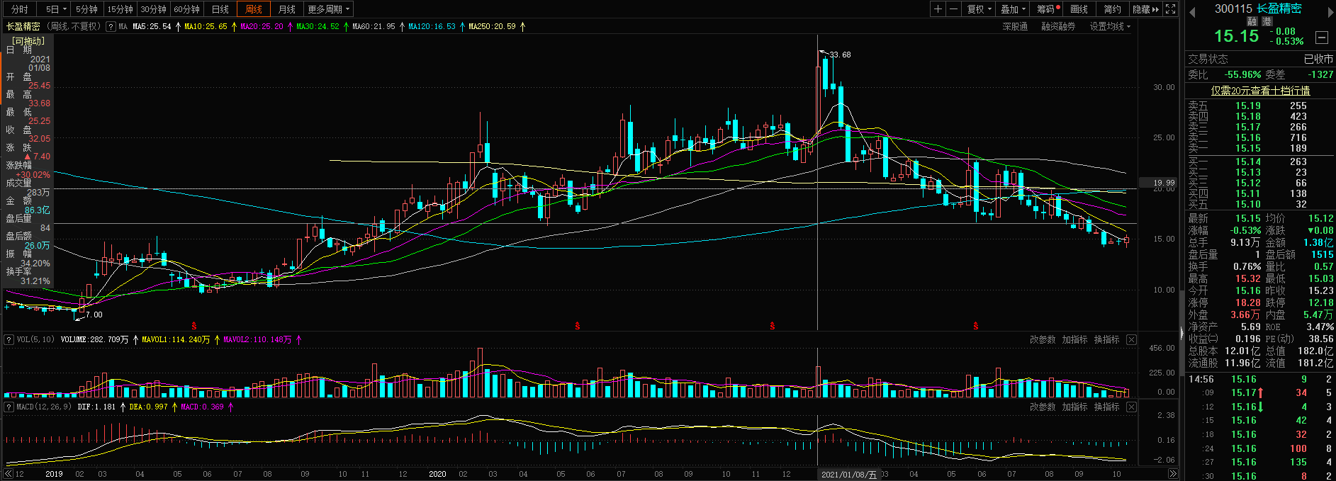 长盈精密报价15.15元/股,较1月下滑46%;