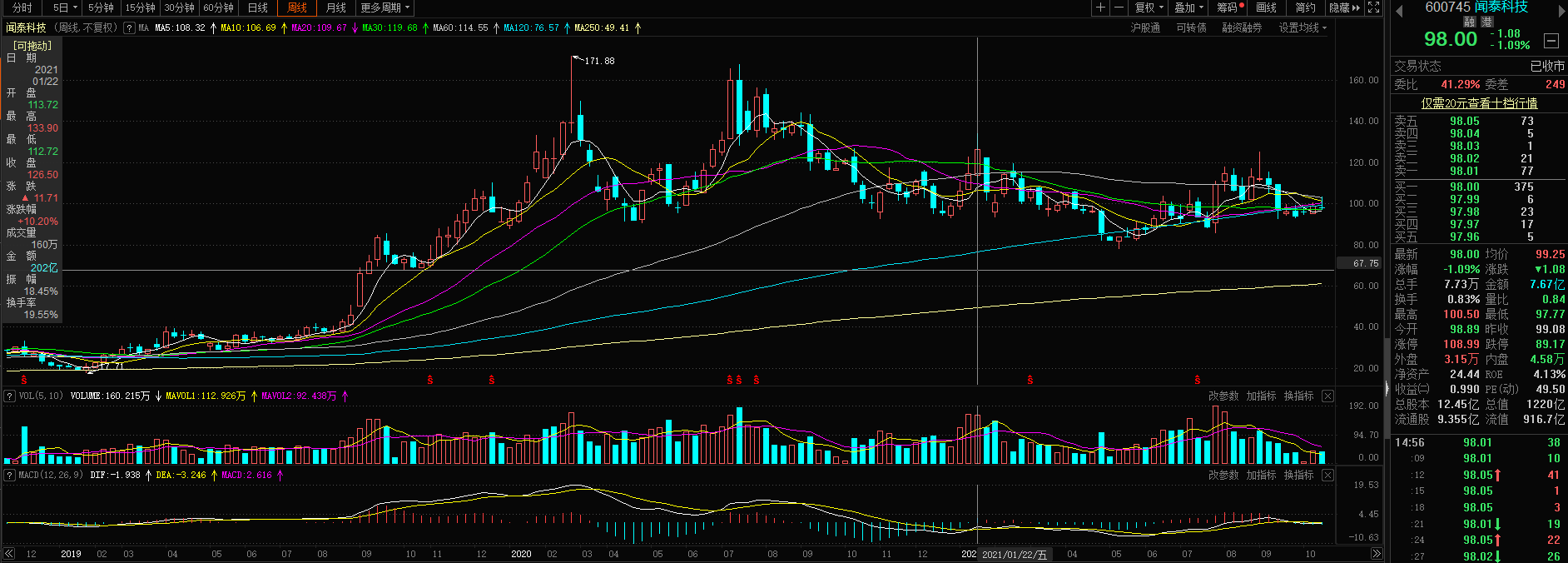 闻泰科技报价98.00元/股,较1月下滑了27%;