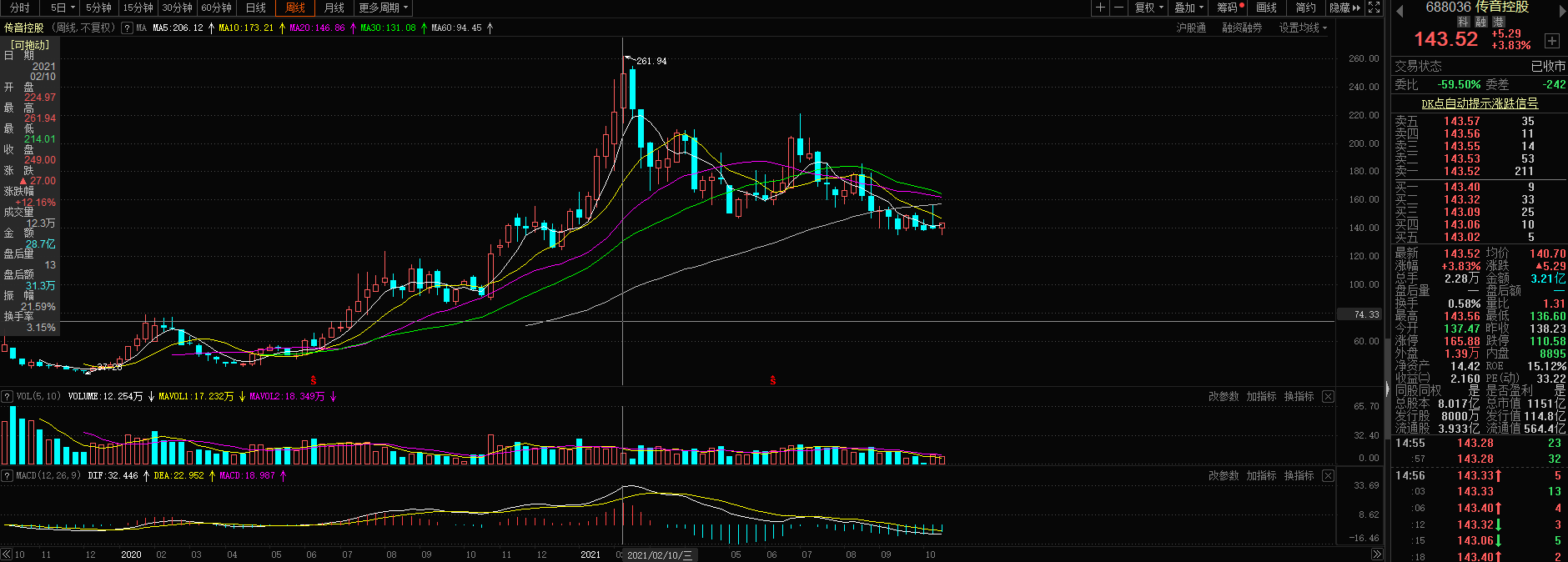 传音控股报价143.52元/股,较2月降幅为45%。