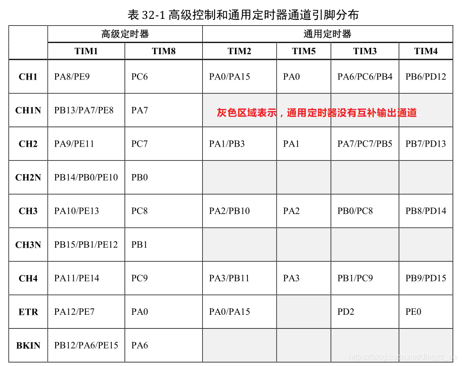高级定时器和通用定时器的引脚分布: