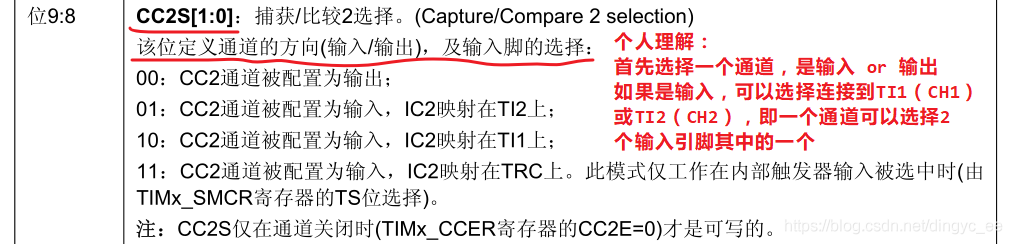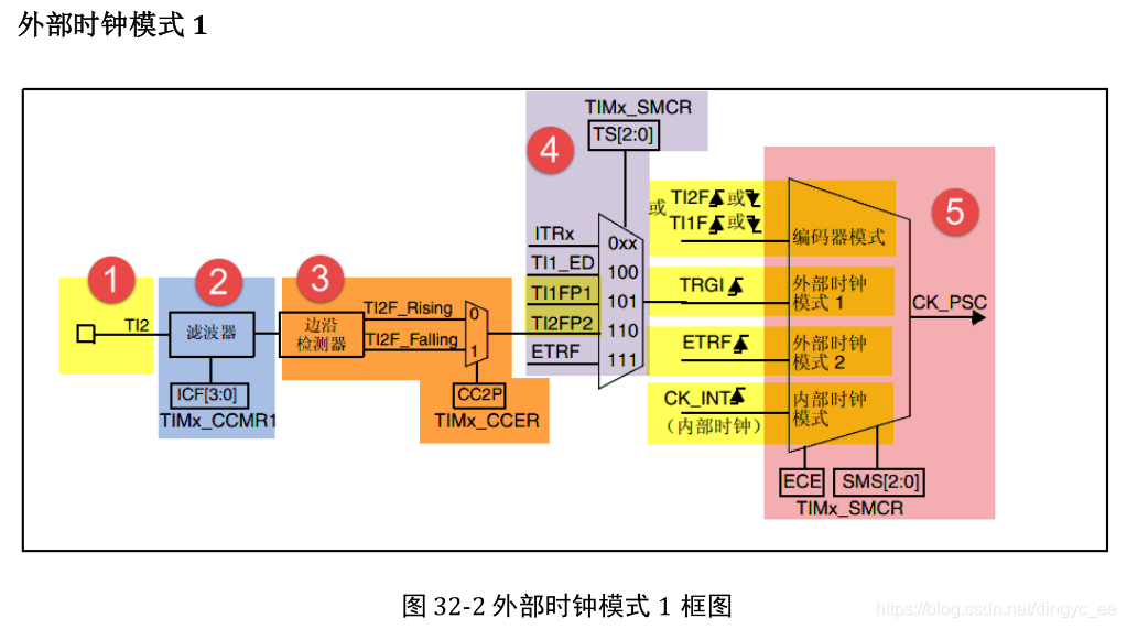 由TIM_CCMRx 的位 CCxS[1:0]配置,其中 CCMR1 控制 TI1 / 2, CCMR2 控制 TI3 / 4