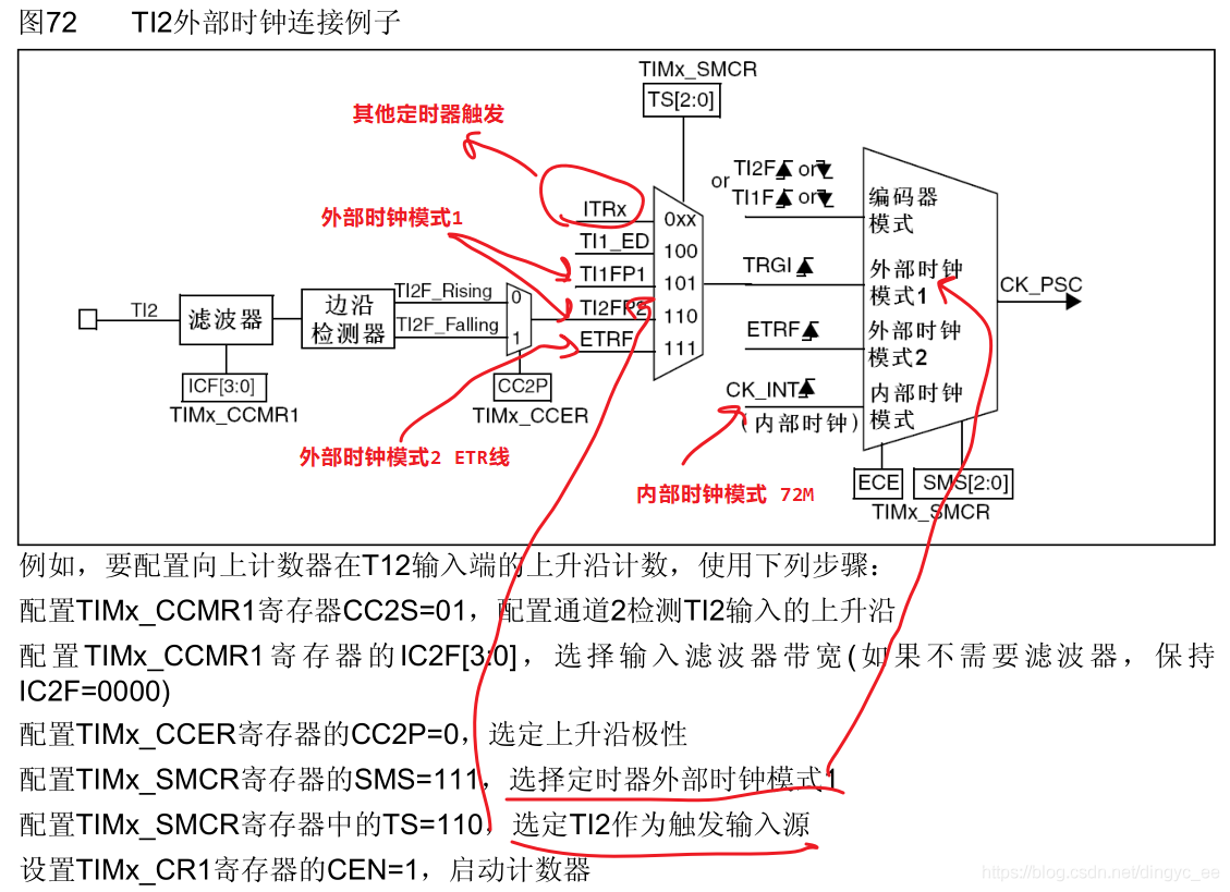 选定了触发源信号后,最后我们需把信号连接到 TRGI 引脚,让触发信号成为外部时钟模式 1 的输入,最终等于 CK_PSC,然后驱动计数器 CNT 计数。