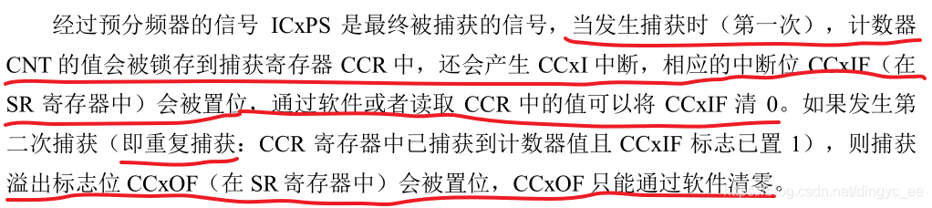 捕获通道 ICx 的输出信号会经过一个预分频器,用于决定发生多少个事件时进行一次捕获。具体的由寄存器 CCMRx 的位 ICxPSC配置,如果希望捕获信号的每一个边沿,则不分频。