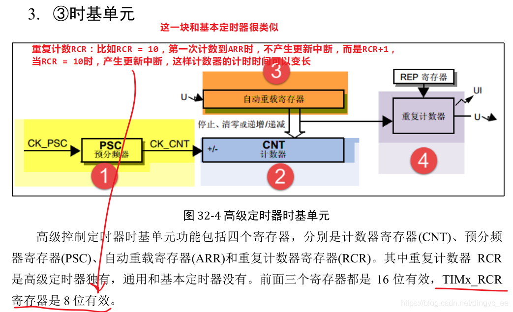 计数器16bit,上 / 下 / 两边 计数,TIM1和TIM8,还有一个重复计数器RCR,独有;