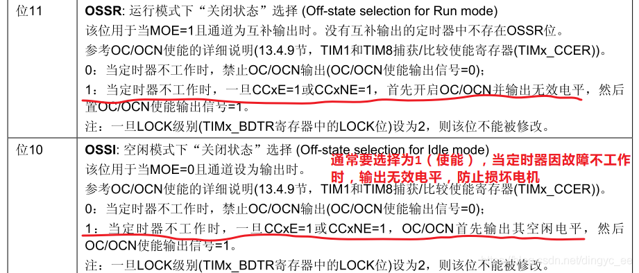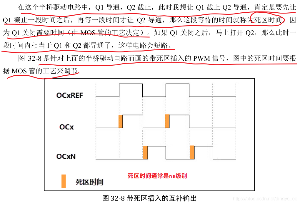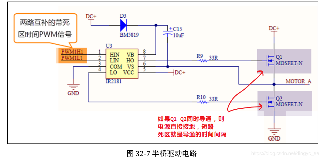 在生成的参考波形 OCxREF 的基础上,可以插入死区时间,用于生成两路互补的输出信号 OCx 和 OCxN,死区时间的大小具体由 BDTR 寄存器的位 DTG[7:0]配置。死区时间的大小必须根据 与输出信号相连接的器件及其特性来调整。下面我们简单举例说明下带死区的PWM 信号的应用,我们以一个板桥驱动电路为例。