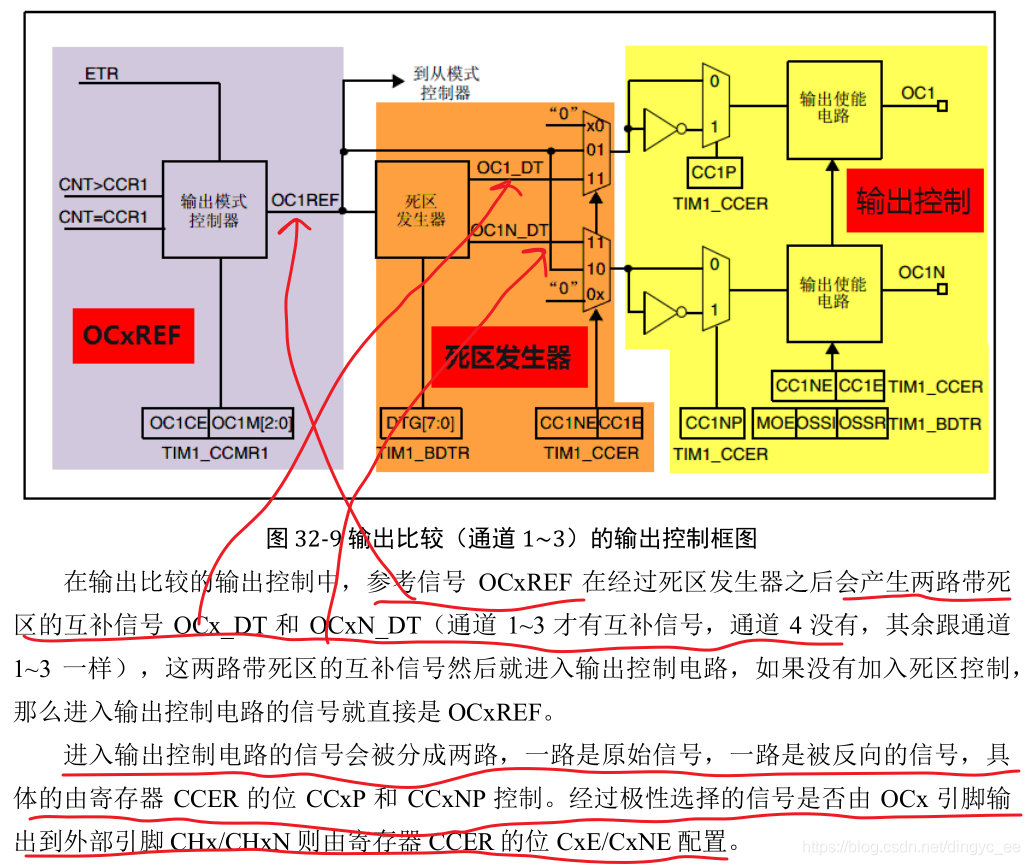 当计数器 CNT 的值跟比较寄存器 CCR 的值相等的时候,输出参考信号 OCxREF 的信号的极性就会改变,其中 OCxREF=1(高电平)称之为有效电平,OCxREF=0(低电平)称之为无效电平,并且会产生比较中断 CCxI,相应的标志位 CCxIF(SR 寄存器中)会置位。然后 OCxREF再经过一系列的控制之后就成为真正的输出信号 OCx/OCxN。