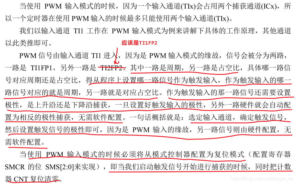2 PWM输入测量:一路输入信号(TI1)占用两个捕获通道(IC1 和 IC2)。