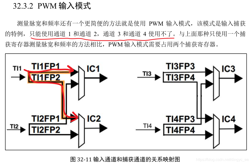 这里我们要搞清楚输入通道和捕获通道的区别,输入通道是用来输入信号的,捕获通道是用来捕获输入信号的通道,一个输入通道的信号可以同时输入给两个捕获通道。比如输入通道 TI1 的信号经过滤波边沿检测器之后的 TI1FP1 和 TI1FP2 可以进入到捕获通道IC1 和 IC2,其实这就是 PWM 输入捕获,只有一路输入信号(TI1)却占用了两个捕获通道(IC1 和 IC2)。当只需要测量输入信号的脉宽时候,用一个捕获通道即可。