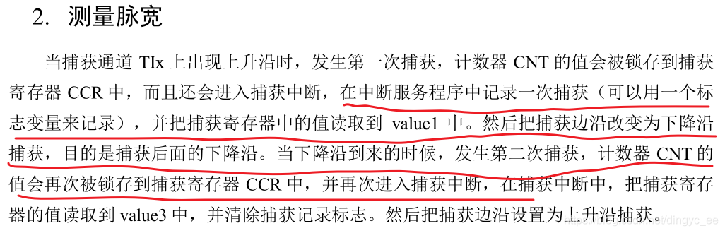 1 普通脉宽测量:当检测到第一个上升沿时,计数器CNT开始从0计数,又检测到下降沿时产生中断,此时的CNT值被锁存到CCR寄存器中,此时CCR的值就对应高电平的时间。