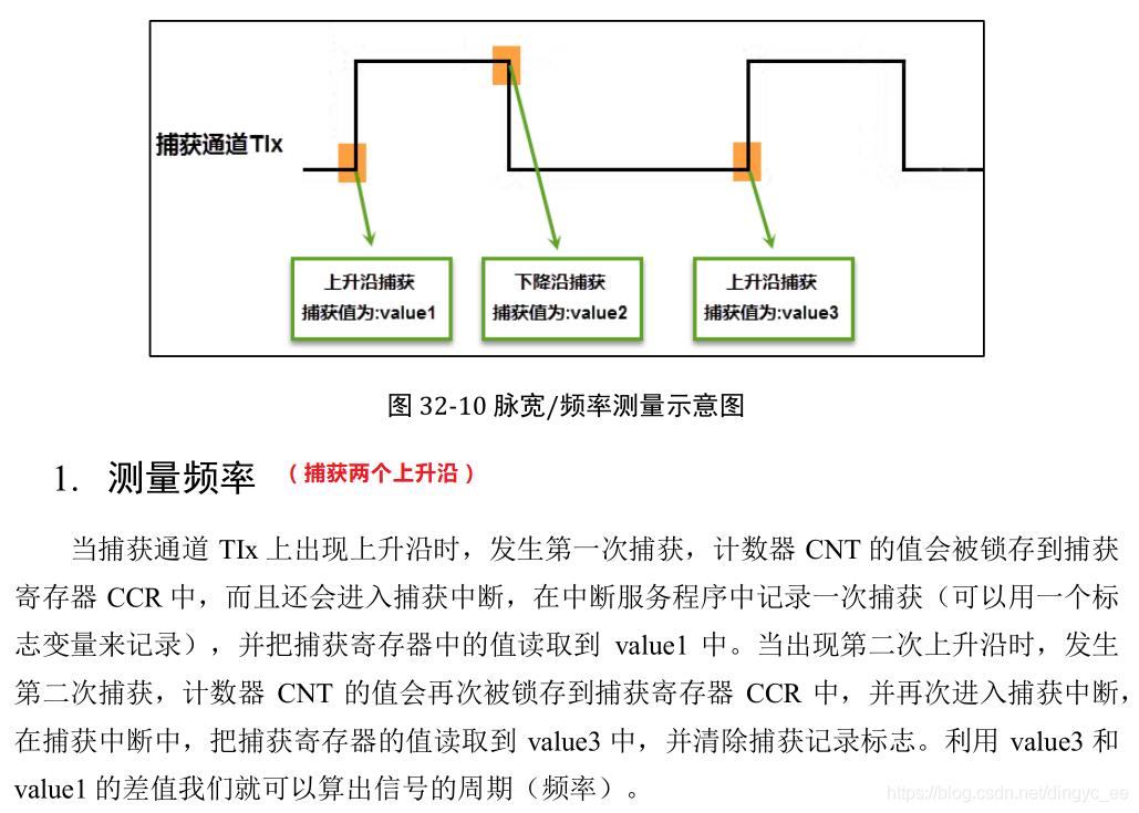 输入捕获可以对输入的信号的上升沿,下降沿或者双边沿进行捕获,常用的有测量输入信号的脉宽和测量 PWM 输入信号的频率和占空比这两种。
