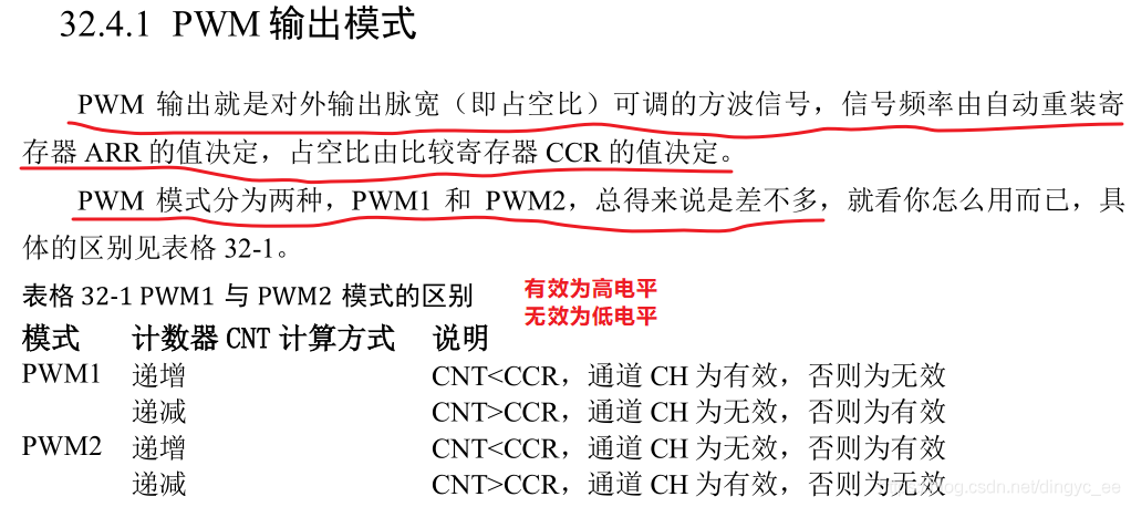 PWM 输出就是对外输出脉宽(即占空比)可调的方波信号,信号频率由自动重装寄存器 ARR 的值决定,占空比由比较寄存器 CCR 的值决定。