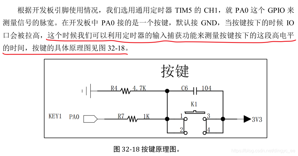 当按键没有按下时,由硬件电路自动拉低。如果按键按下,则PA0产生上升沿,我们进行脉宽测量时,首先设置为上升沿捕获,然后在第一次捕获到上升沿时,将计数器清零,并设置捕获极性为下降沿捕获。当第二次捕获到信号时,就是一个完整的高电平时间。值得注意的是,如果定时器溢出频率为72M(预分频系数71)时,最大计数值为65536us,要考虑溢出(更新中断)。