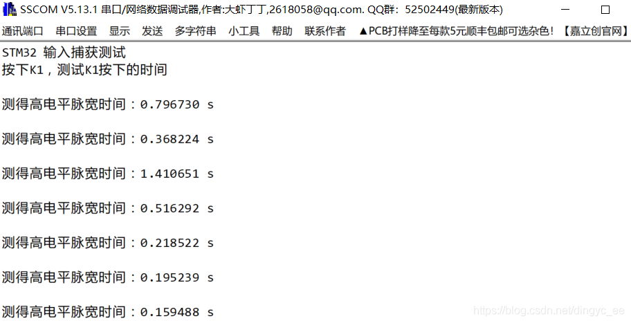 #include void delay(uint32_t count); int main(void) { uint32_t time; // TIM 计数器的驱动时钟 uint32_t TIM_PscCLK = 72000000 / (GENERAL_TIM_PSC + 1); /* 串口初始化 */ USART_config(); GENERAL_TIM_Init(); printf ( "STM32 输入捕获测试rn" ); printf ( "按下K1,测试K1按下的时间rn" ); while (1) { if(TIM_ICUserValueStructure.Capture_FinishFlag == 1) { // 计算高电平时间的计数器的值 time = TIM_ICUserValueStructure.Capture_Period * (GENERAL_TIM_PERIOD+1) + (TIM_ICUserValueStructure.Capture_CcrValue+1); // 打印高电平脉宽时间 printf ( "rn测得高电平脉宽时间:%d.%d srn",time/TIM_PscCLK,time%TIM_PscCLK ); TIM_ICUserValueStructure.Capture_FinishFlag = 0; } } } 测试结果为: