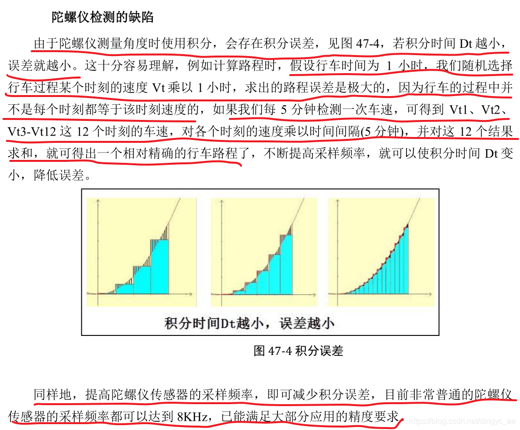 例如:每秒对陀螺仪进行一次采样,t = 0s时,初始角度为0°,t = 1s时,得到一个角加速度为20°/s,t = 2s时,得到第二个角加速度25°/s,t = 3s时,得到第三个角加速度为50°/s...以此类推。那么,可以大致的求得:20×t(0,1)+25×t(1, 2)+50×t(2, 3)=95°,也就是说,在3秒后,陀螺仪旋转了95°。但这种方式很明显是存在误差的,因为时间间隔比较大。可以预期的是,当我们把时间间隔减小(即提高采样率时),陀螺仪计算得到的旋转角的精度也会提高,这就是陀螺仪的积分误差,如下图所示: