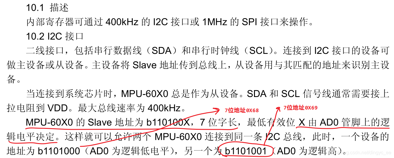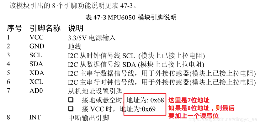 接下来看一下MPU6050的I2C地址配置(来自于用户说明手册):