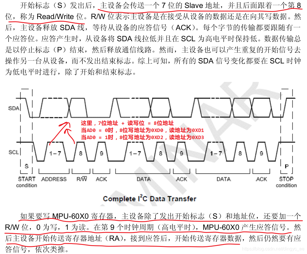 实际上在使用I2C访问MPU6050时,发送设备地址(7位)+ 读写位 组成8位地址(0XD0 或 0XD2)