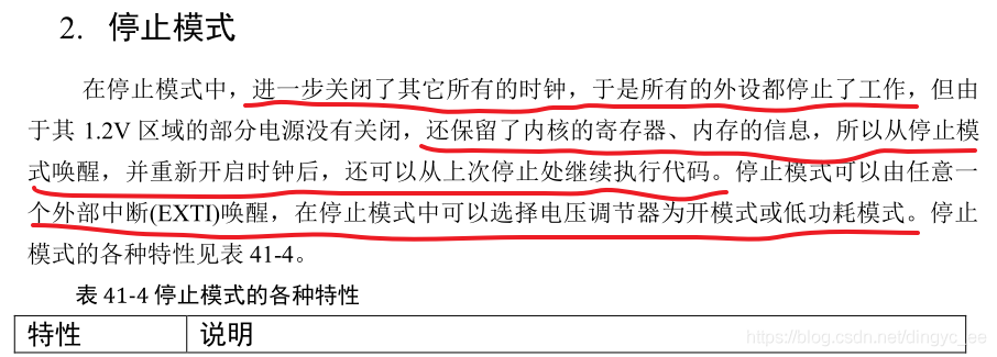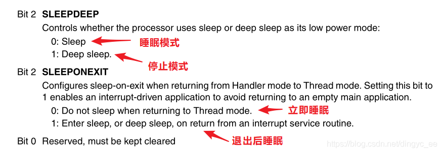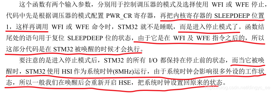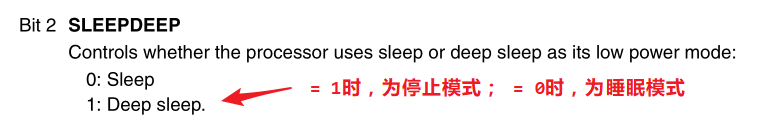 在执行最后一句代码前,系统由于调用了__WFI 或 __WFE,已经进入了停止模式,因此,这句清除SLEEPDEEP 位并不会执行。而当内核重新被唤醒时,才会清除SLEEPDEEP位,方便使用。